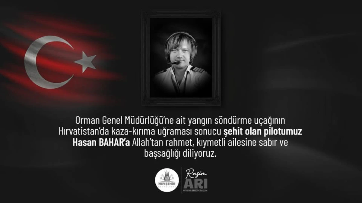 Nevşehir Belediye Başkanı Rasim Arı, Orman Genel Müdürlüğü’ne ait yangın söndürme uçağının Hırvatistan’da kaza kırıma uğraması sonucu şehit olan pilot Hasan Bahar için bir başsağlığı mesajı yayımladı.