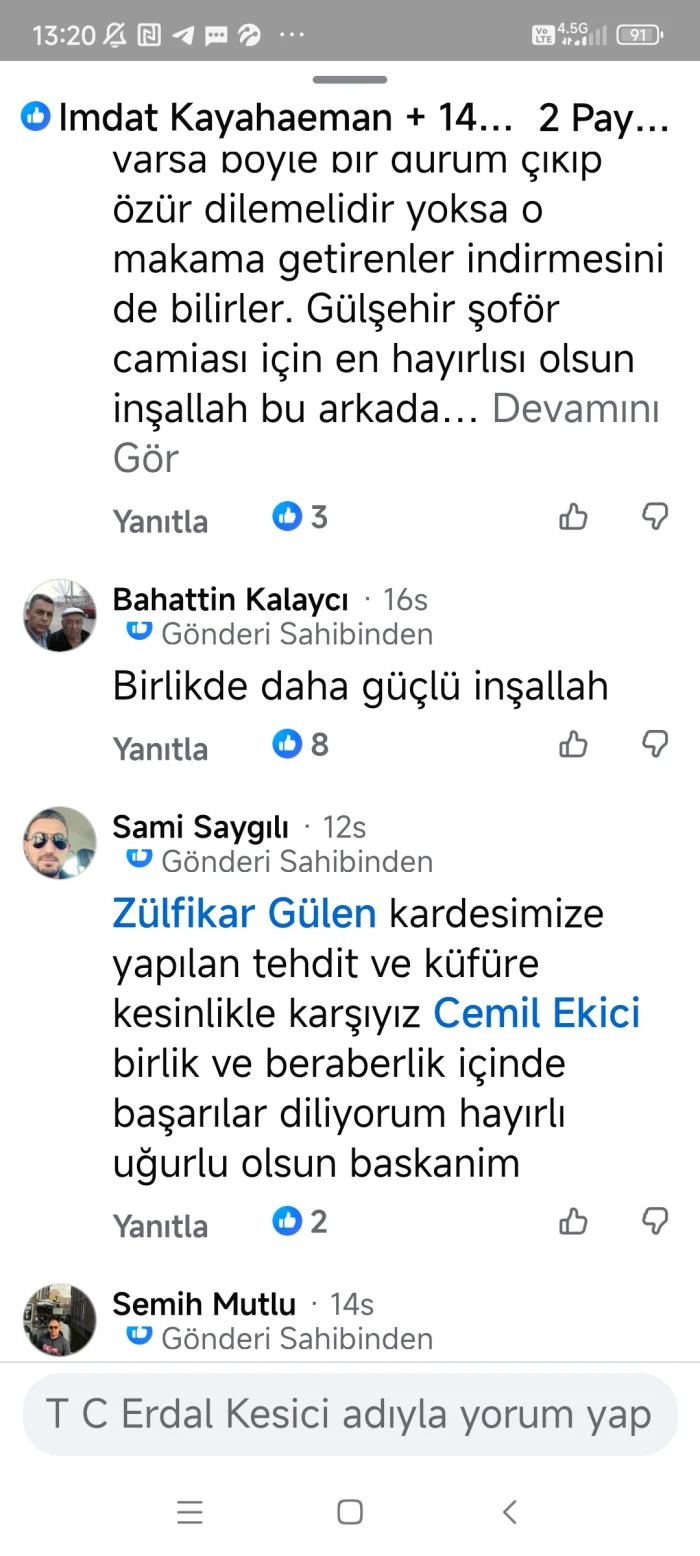 Olayın duyulmasının ardından Gülşehir halkı sessizliğini bozarak sosyal medyada geniş çaplı bir destek hareketi başlattı. İddia edilen sözlü saldırı ve baskı haberlerinin yayılmasıyla birlikte, Gülşehirli vatandaşlar hem Zülfikar Gülen’in hem de Cemil Ekici’nin yanında saf tuttu. Sosyal medya platformları üzerinden yapılan paylaşımlarda, demokratik bir yarışın hakaret ve tehditlerle gölgelenemeyeceğine vurgu yapıldı.Vatandaşların paylaşımlarında öne çıkan noktalar: Demokrasi Vurgusu: Seçim sürecinin hür iradeyle yürütülmesi gerektiği, baskıların kabul edilemez olduğu belirtildi. Dayanışma Mesajları: "Zülfikar Gülen yalnız değildir" ve "Cemil Ekici ile dürüst yönetim" etiketleriyle yüzlerce destek mesajı paylaşıldı. Sağduyu Çağrısı: İlçedeki huzur ortamının bozulmaması adına yetkililerin ve oda başkanlarının daha sorumlu davranması gerektiği ifade edildi. "Baskılar Karşılık Bulmayacak" Gülşehir halkı, esnafın ve şoförlerin kaderini tayin edecek olan seçimlerin "korku iklimi" altında yapılmasına karşı dik duruş sergiliyor. Birçok vatandaş, yapılan bu tür eylemlerin adayların azmini kırmayacağını, aksine halkın bu isimler etrafında daha sıkı kenetlenmesine vesile olduğunu dile getirdi.