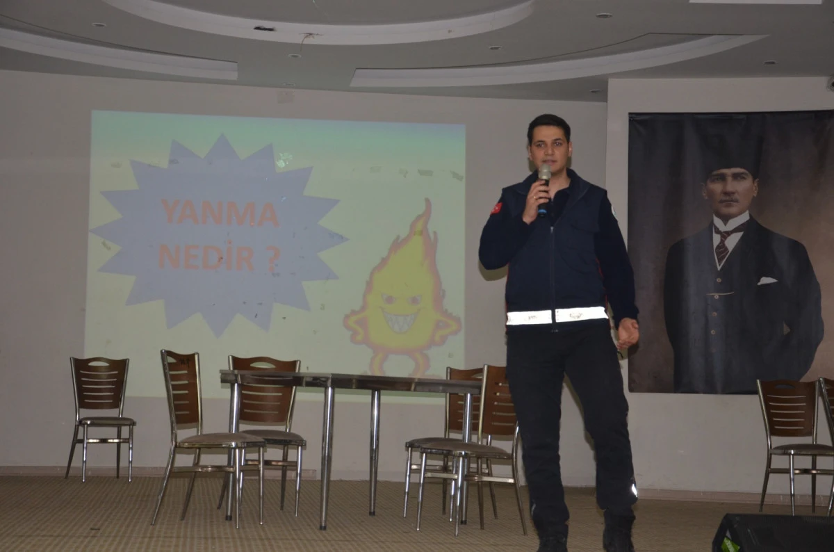 Burada yangına nasıl müdahale edilmesi gerektiği ve yangın tüpünün kullanımı anlatıldı.