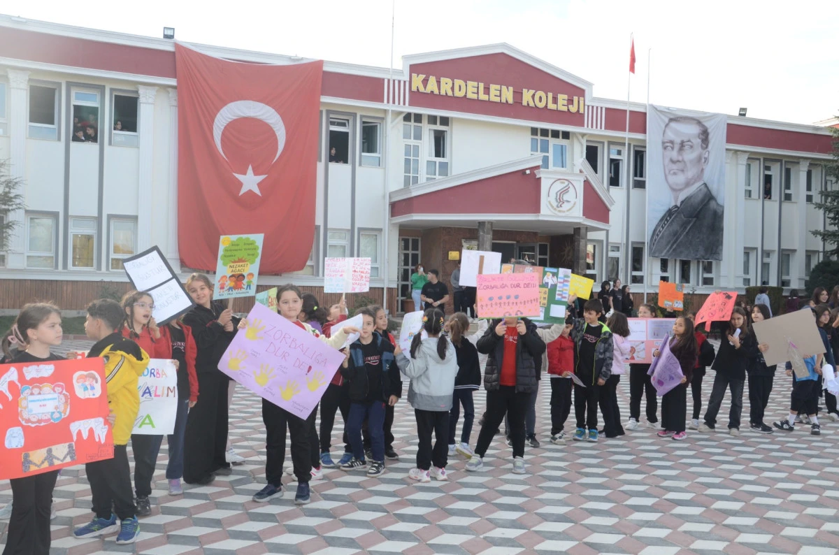 Kardelen Eğitim Kurumları İlköğretim 3. sınıf öğrencileri, akran zorbalığına dikkat çekmek için “Zorba olma kanka ol” sloganları atarak yürüyüş yaptı.