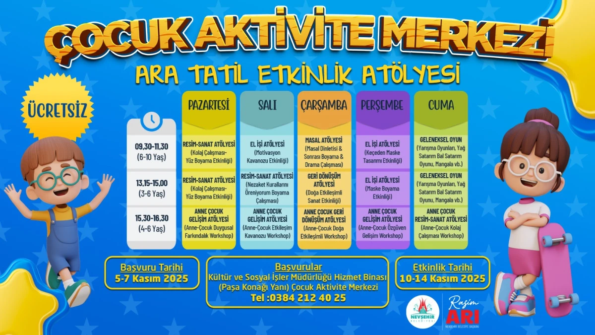 Nevşehir Belediyesi, 10-14 Kasım 2025 tarihleri arasında çocuklara özel eğlenceli ve öğretici bir ara tatil programı sunuyor.