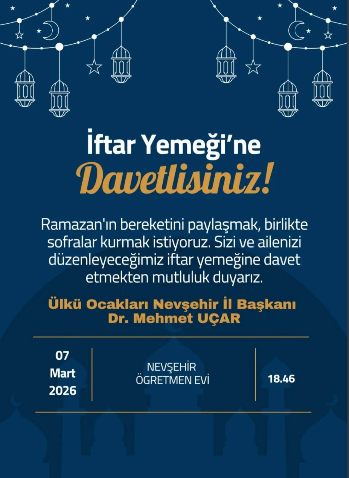 "Ramazan ayı paylaşmanın ve kardeşliğin en müstesna zamanıdır. Biz de 'Gönül Birliği' sloganıyla yola çıkarak hemşehrilerimizle aynı sofrada buluşmak istiyoruz. Manevi atmosferi birlikte solumak ve dayanışmamızı güçlendirmek adına tüm davetlilerimizi bekliyoruz." Dedi