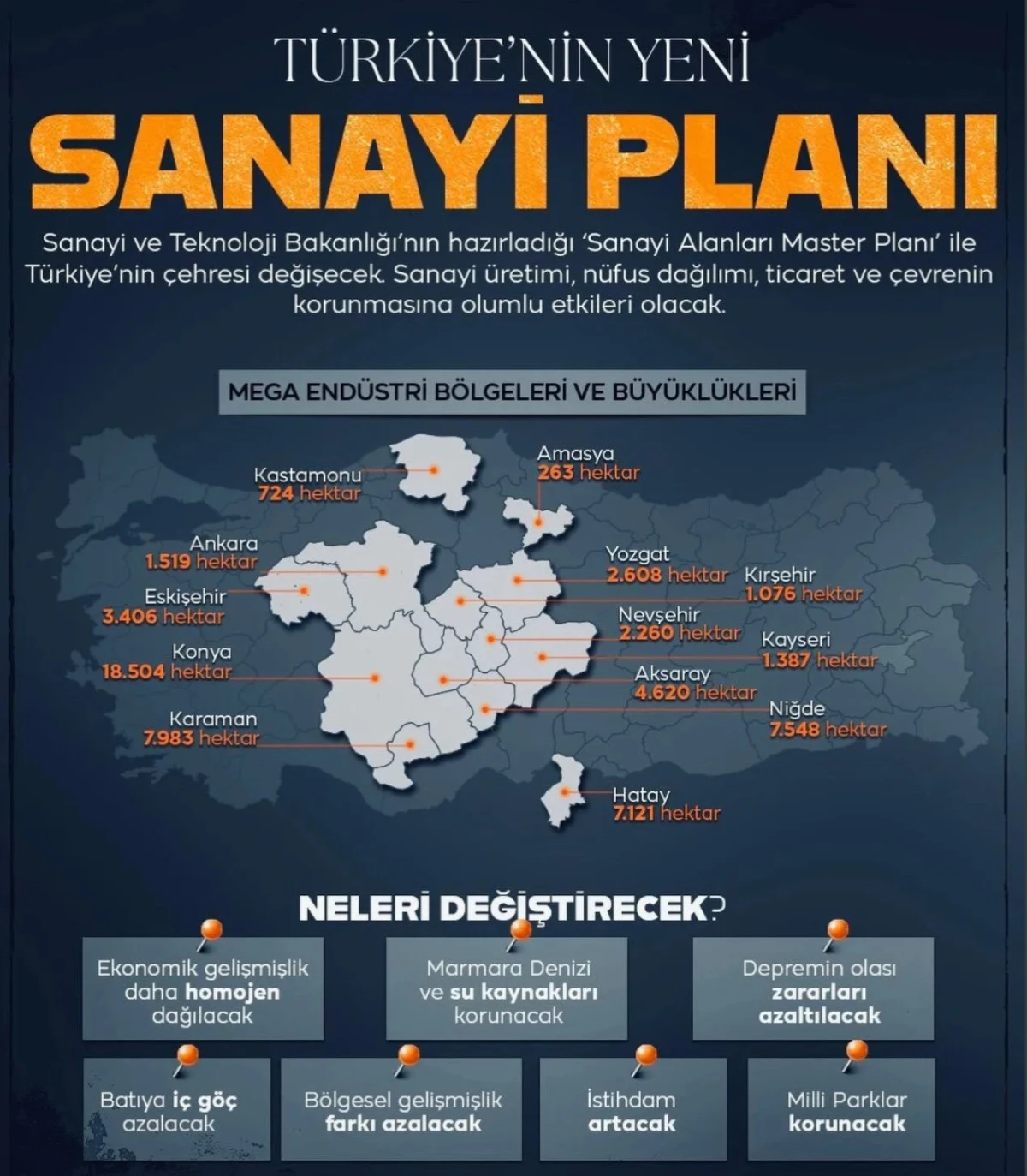Master plan kapsamında oluşturulacak 16 yeni sanayi bölgesi, toplamda 59 bin hektarlık bir alanı kapsıyor. Bu hamleyle birlikte Türkiye’nin sanayi haritasında köklü bir değişim yaşanması ve üretim kapasitesinin maksimize edilmesi hedefleniyor.