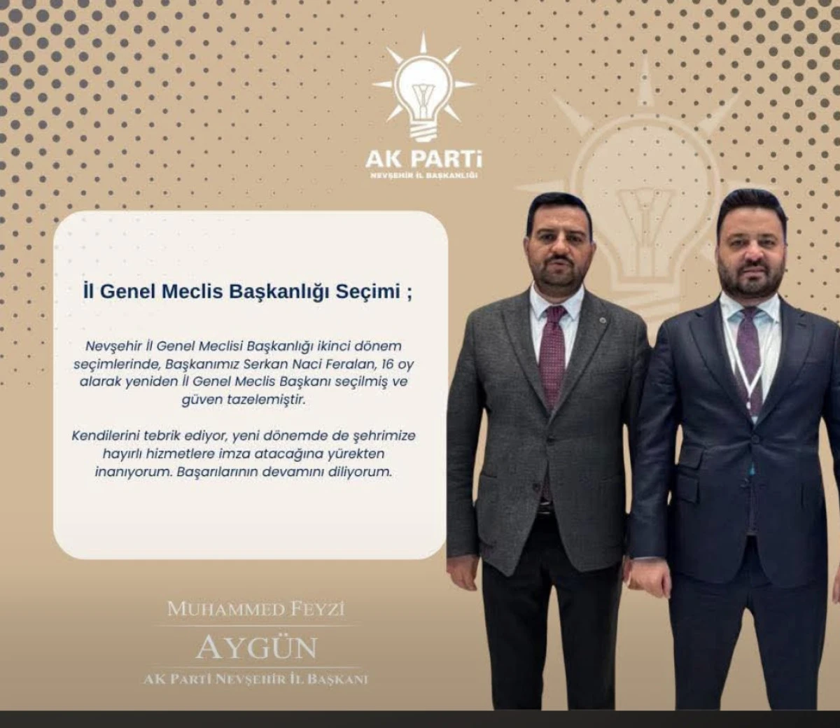 AK Parti Nevşehir İl Başkanı Muhammed Fevzi Aygün, İl Genel Meclisi’nin ikinci dönem başkanlık seçimlerinde yeniden göreve getirilen Serkan Naci Feralan için tebrik mesajı yayımladı.