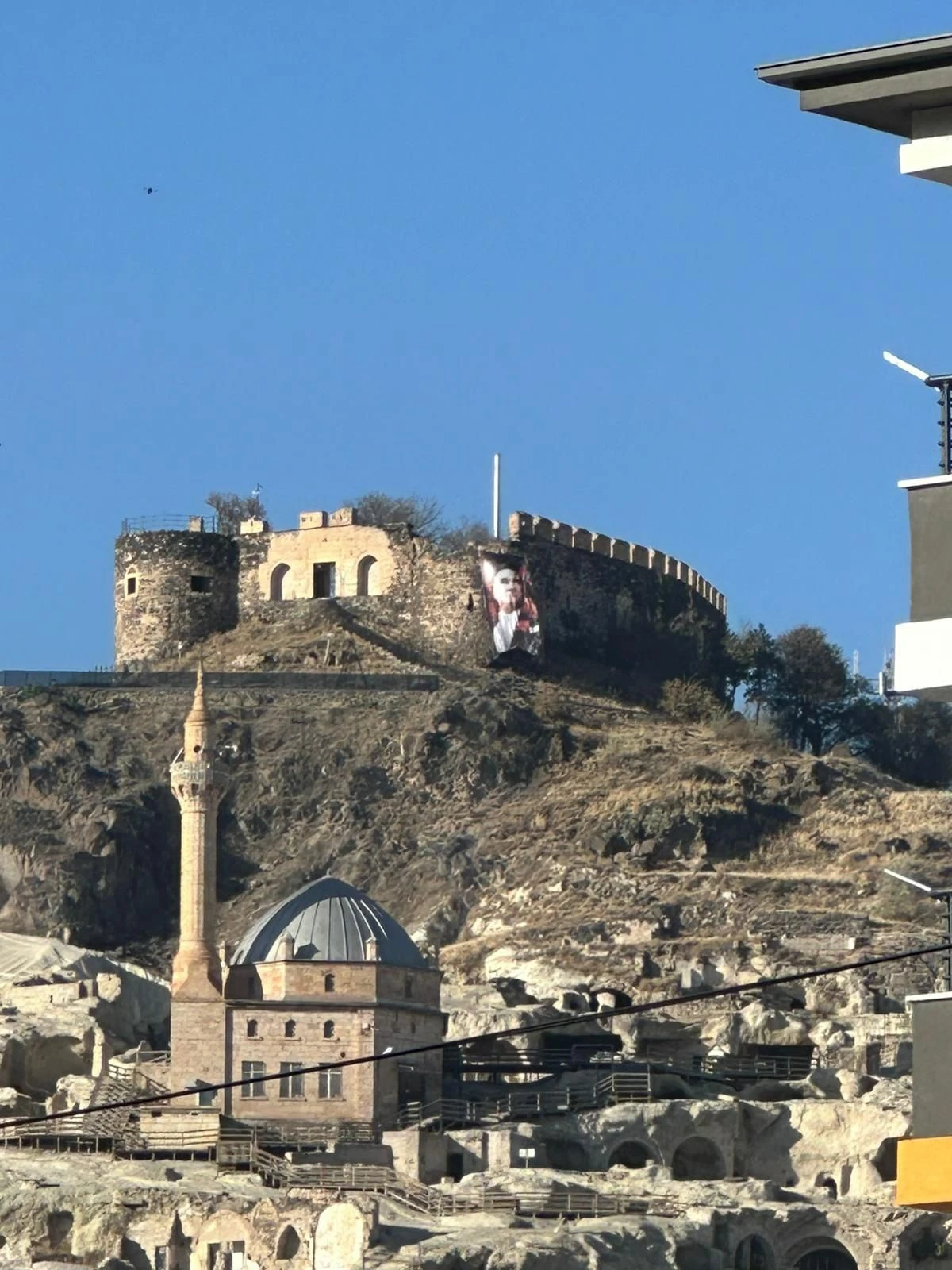 “Atatürk’ü unutturamayacaksınız!” diyerek Nevşehir’in simgesi ve en yüksek noktalarından biri olan Nevşehir Kalesi’ne gençlik kolları dev bir Atatürk posteri astı.