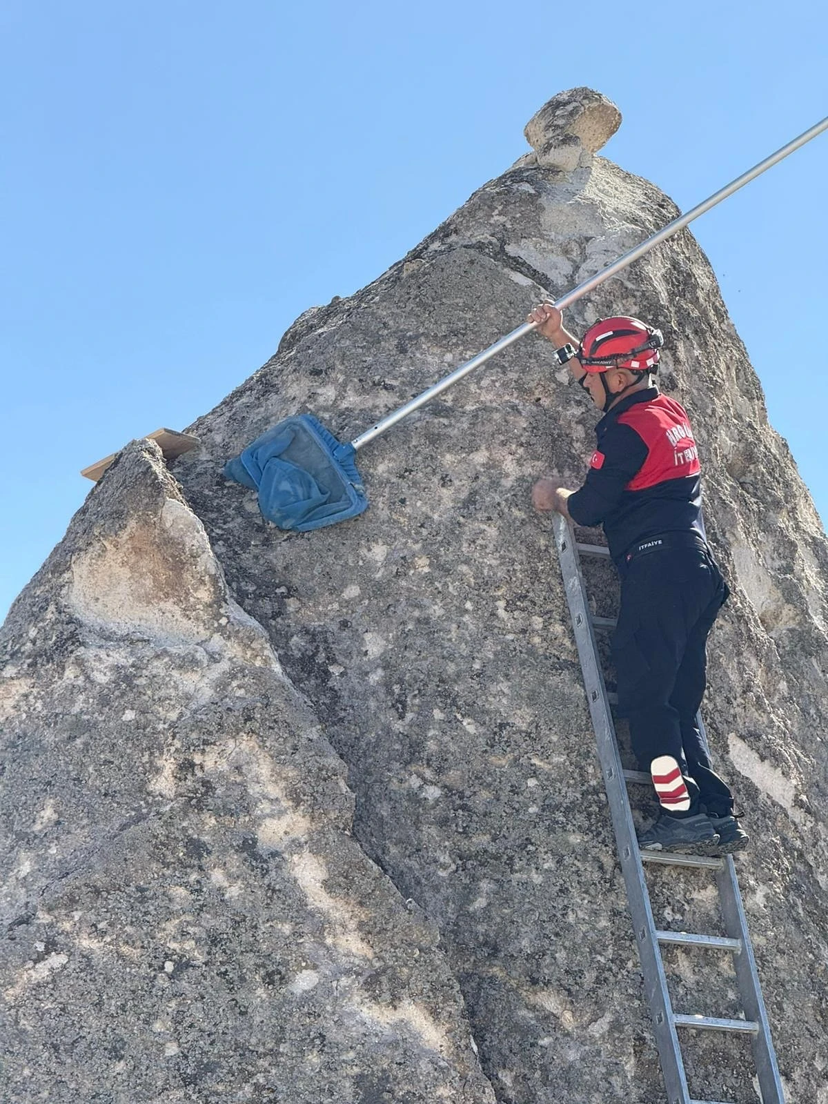 Nevşehir’in Ürgüp ilçesine bağlı Göreme beldesinde peribacasına çıkan ve inemeyen bir kedi, vatandaşların ihbarı üzerine Ürgüp Belediyesi itfaiye ekipleri tarafından kurtarıldı.