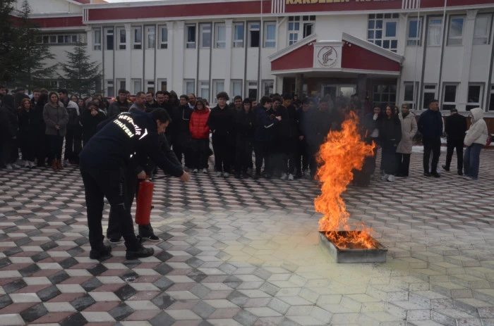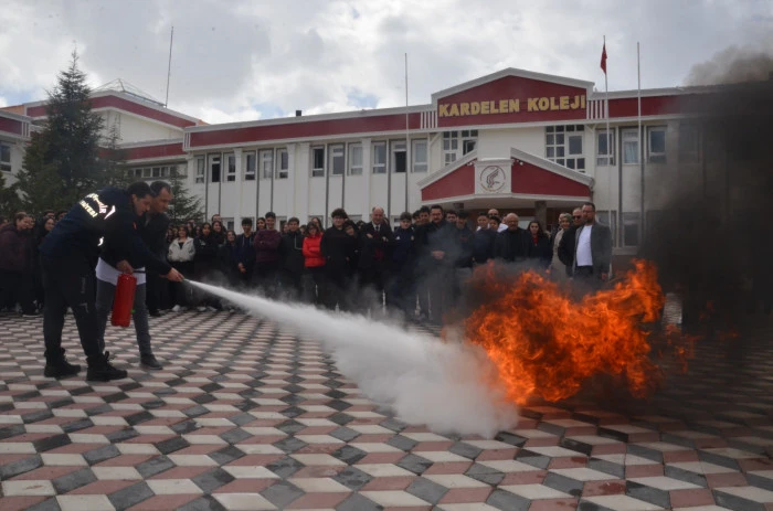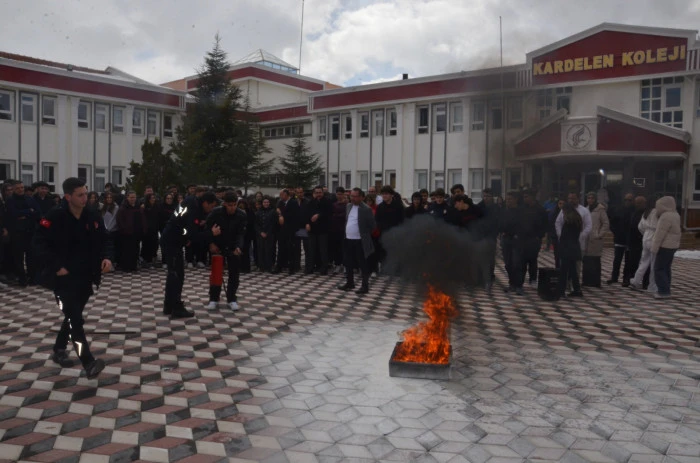 Kardelen Eğitim Kurumları öğrencilerine, yangına müdahale eğitimi verildi, okul bahçesinde yangın söndürme tatbikatı yapıldı.
