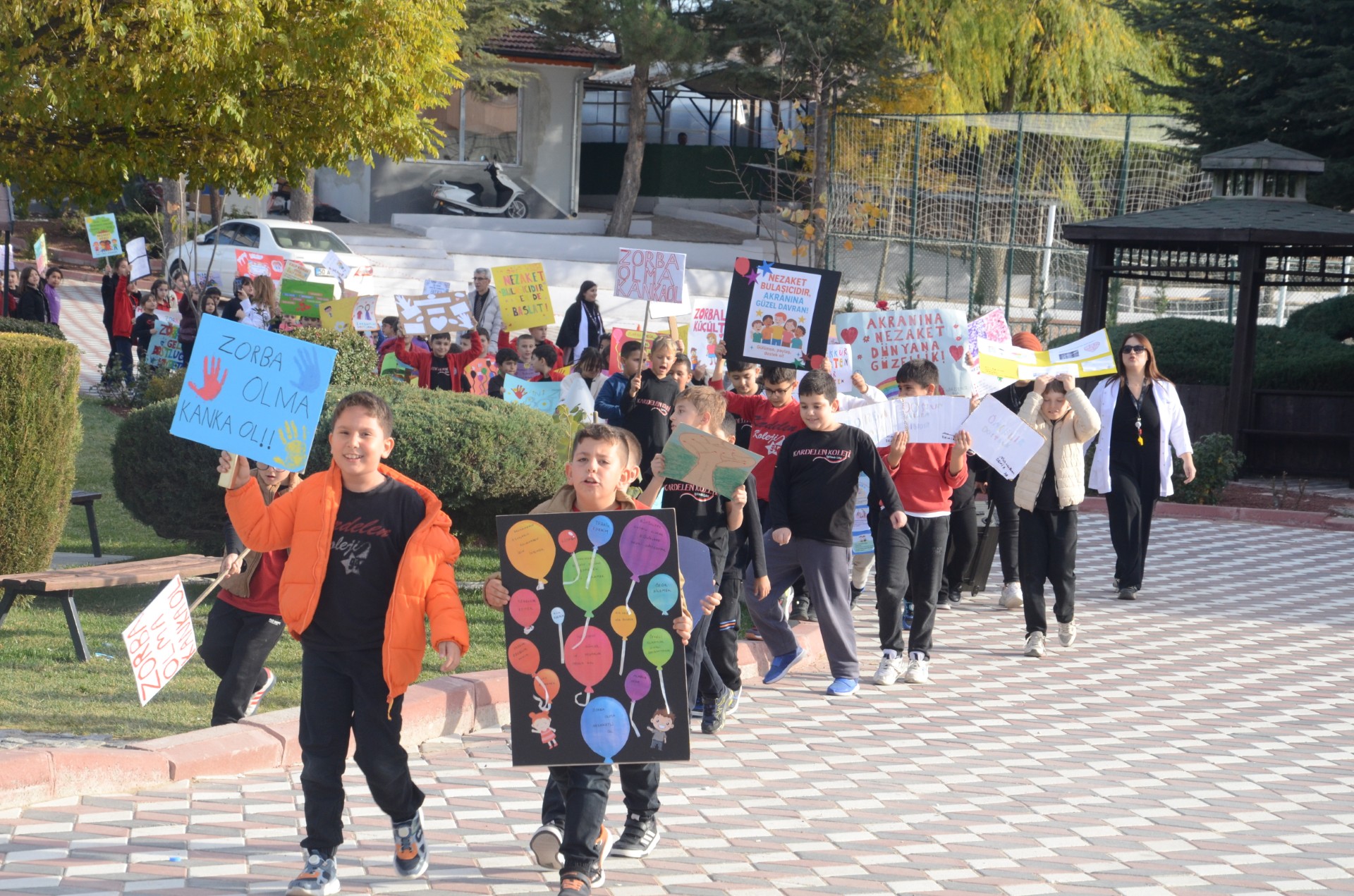 Davranış ve Nezaket Dersi kapsamında yapılan, rehber öğretmeni Deniz Uçar Cengiz ve drama dersi öğretmeni Derya Göncü koordinesinde düzenlenen yürüyüşte öğrenciler, aileleriyle birlikte hazırladığı “Zorba olma kanka ol”, “Zorbalık yok dostluk çok”, “Zorbalık küçültür iyilik büyütür” yazılı dövizlerle yürüdü.