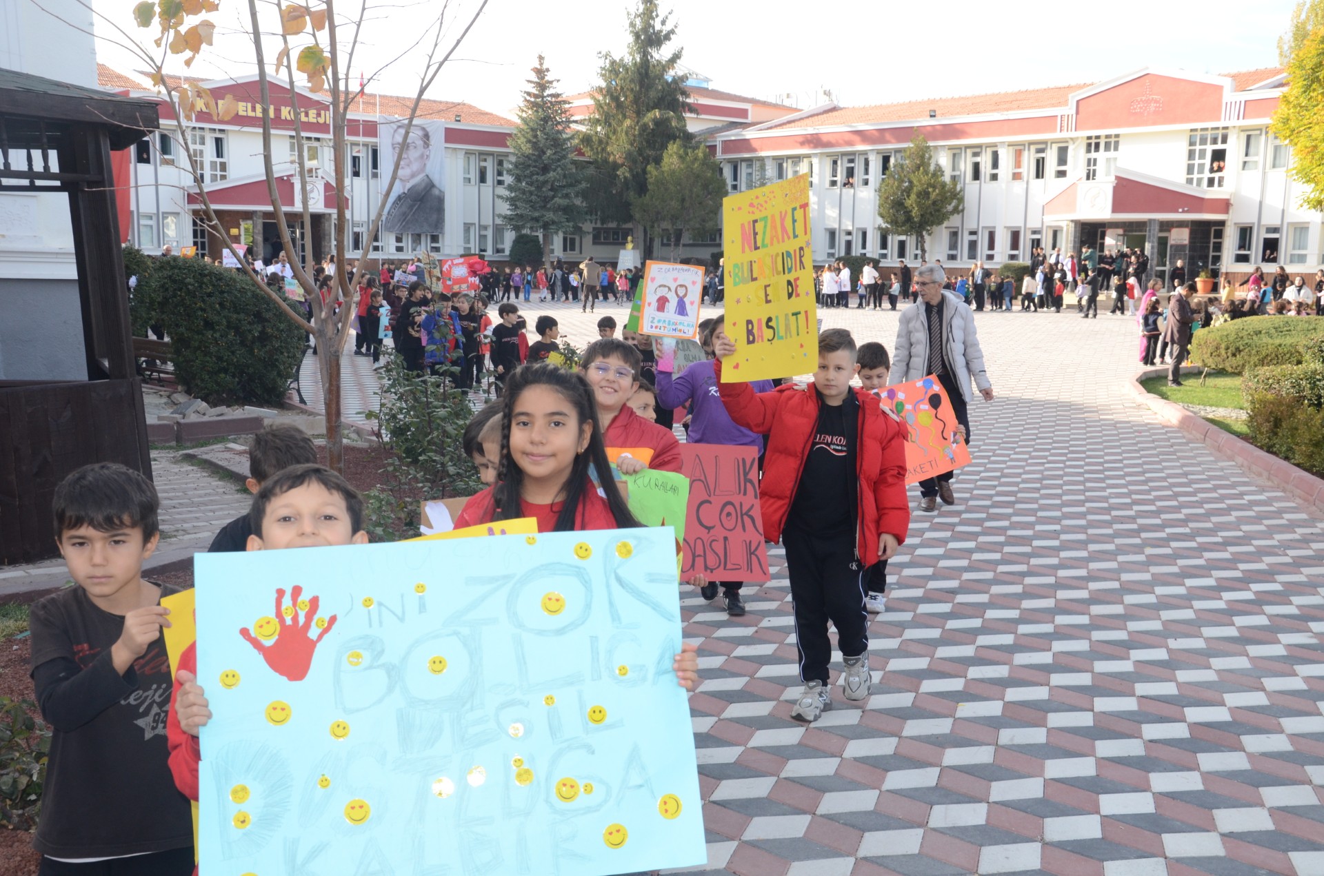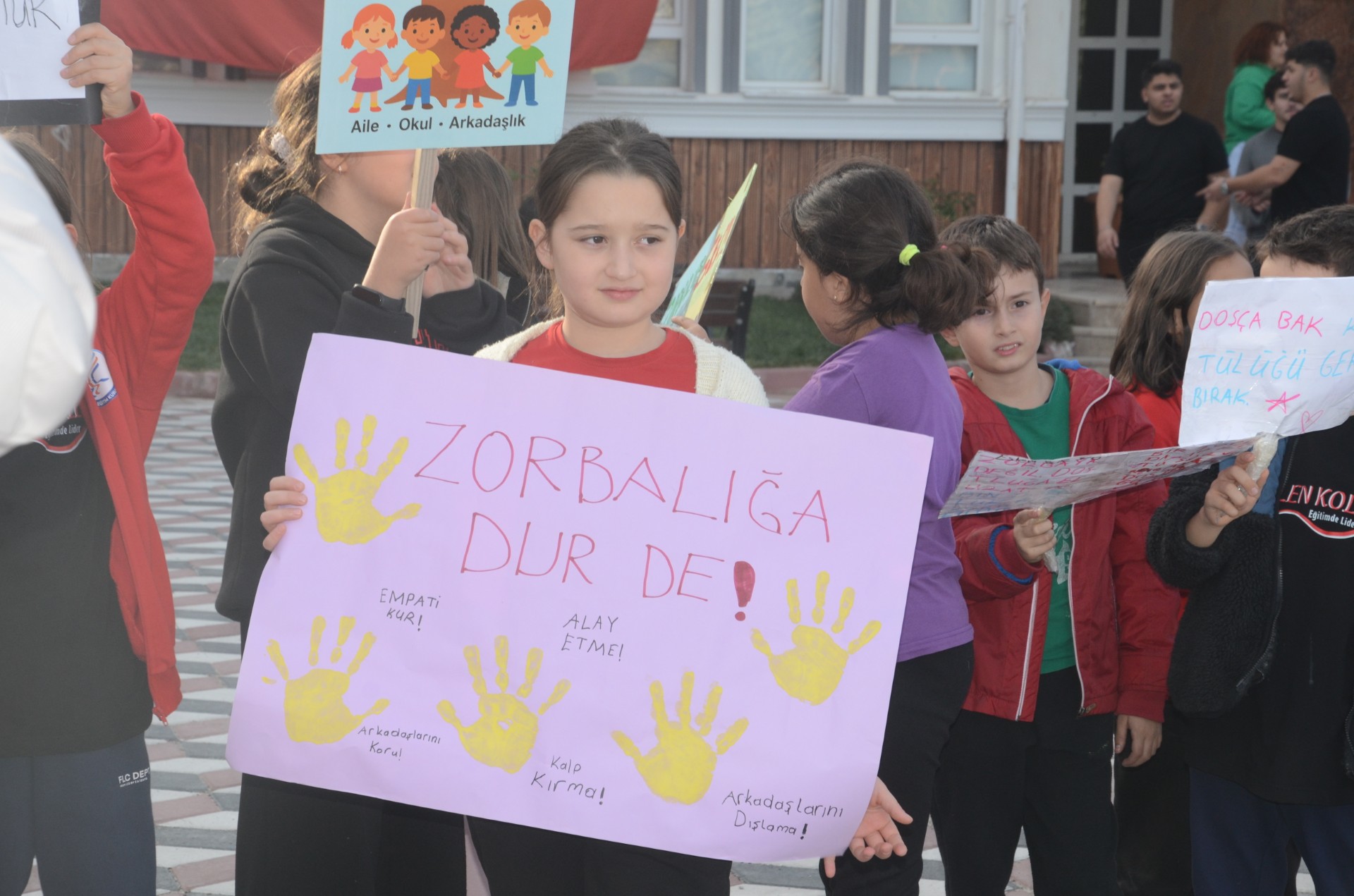 Kardelen Eğitim Kurumları İlköğretim 3. sınıf öğrencileri, akran zorbalığına dikkat çekmek için “Zorba olma kanka ol” sloganları atarak yürüyüş yaptı.