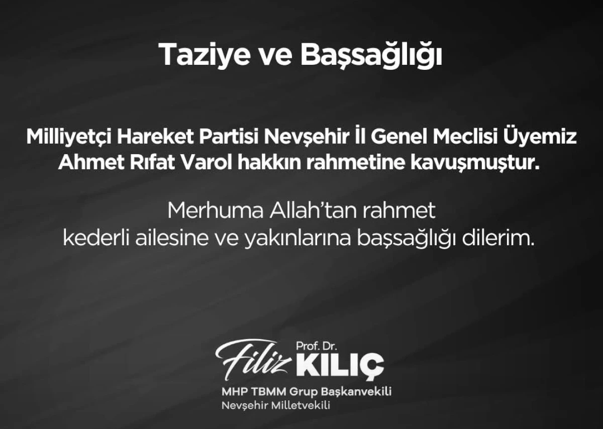MHP Milletvekili Filiz Kılıç’tan Ahmet Rıfat Varol İçin Taziye Mesajı