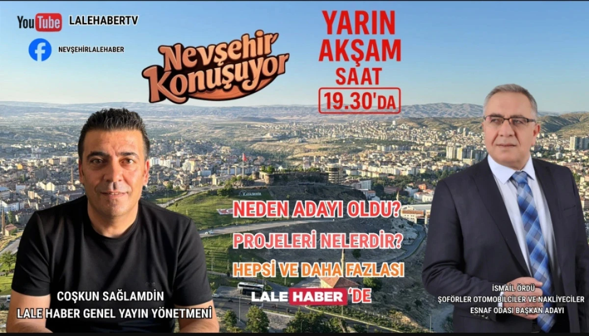 Nevşehir'in nabzını tutan ve gündeme yön veren "Nevşehir Konuşuyor" programı, yine dikkat çeken bir konukla ekranlara geliyor. Bu haftaki yayında, Şoförler, Otomobilciler ve Nakliyeciler Esnaf Odası Başkan Adayı İsmail Ördü, önemli açıklamalarda bulunacak.