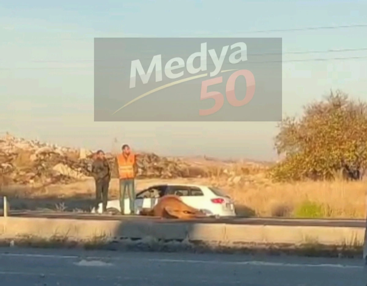 Nevşehir’in Ortahisar beldesinde sabah saatlerinde meydana gelen trafik kazasında, yolun karşısına geçmeye çalışan başıboş iki ata otomobil çarptı.